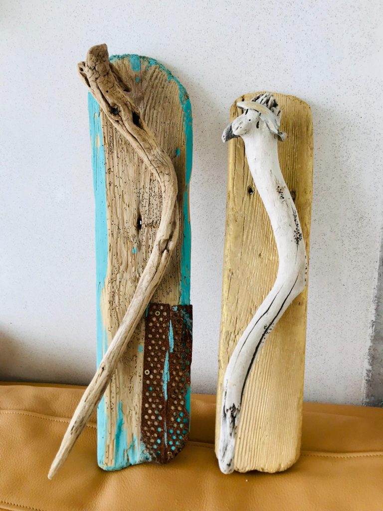 Ich liebe es am Strand spazieren zu gehen, denn die Natur fasziniert mich. Ich verwerte zwar keine recycelten Materialien, aber ich recycle Hölzer, die das Meer wieder an Land spielt, aus welchem Leben sie auch stammen.